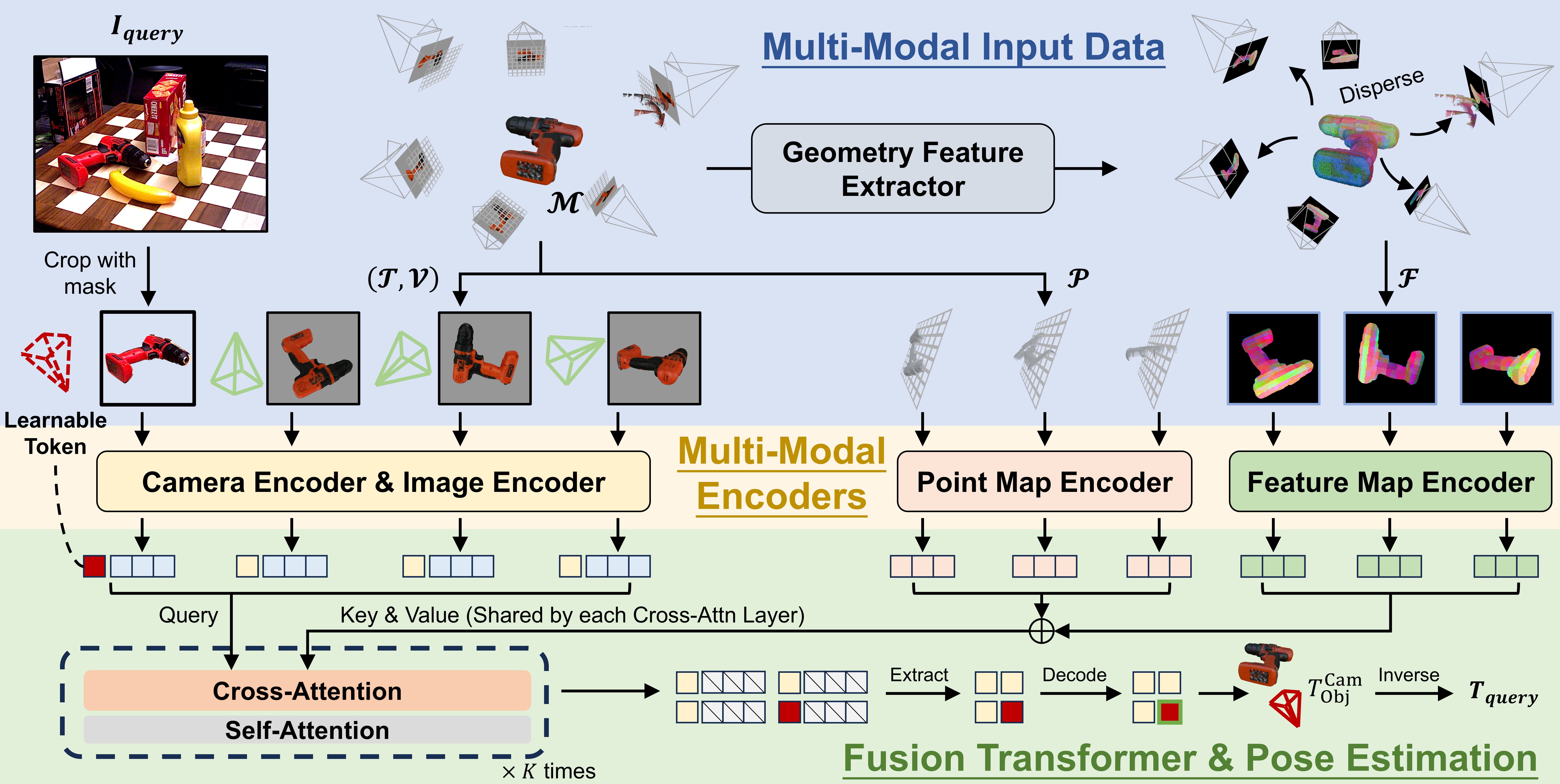 The Workflow of PoseGAM. Given a query image \( I_{\text{query}} \) and an object mesh \( \mathcal{M} \), the goal is to estimate the object-to-camera transformation \( T_{\text{query}} \). A set of camera poses is sampled around \( \mathcal{M} \) to render images \( \mathcal{V} \) and corresponding point maps \( \mathcal{P} \). Both \( I_{\text{query}} \) (with its foreground segmented) and \( \mathcal{V} \) are encoded into image tokens, each paired with a camera token. For the rendered views \( \mathcal{V} \), the camera tokens are computed from known intrinsics and extrinsics, whereas for \( I_{\text{query}} \) the camera token is a learnable embedding. A geometry feature extractor produces a global object representation, which is distributed to camera views to form view-specific features \( \mathcal{F} \). These, together with point maps \( \mathcal{P} \), are encoded as key–value tokens for cross-attention. The output camera tokens are decoded to predict the camera-to-object transformation \( T^{\text{Cam}}_{\text{Obj}} \), from which the final object-to-camera pose \( T_{\text{query}} \) is obtained by matrix inversion.